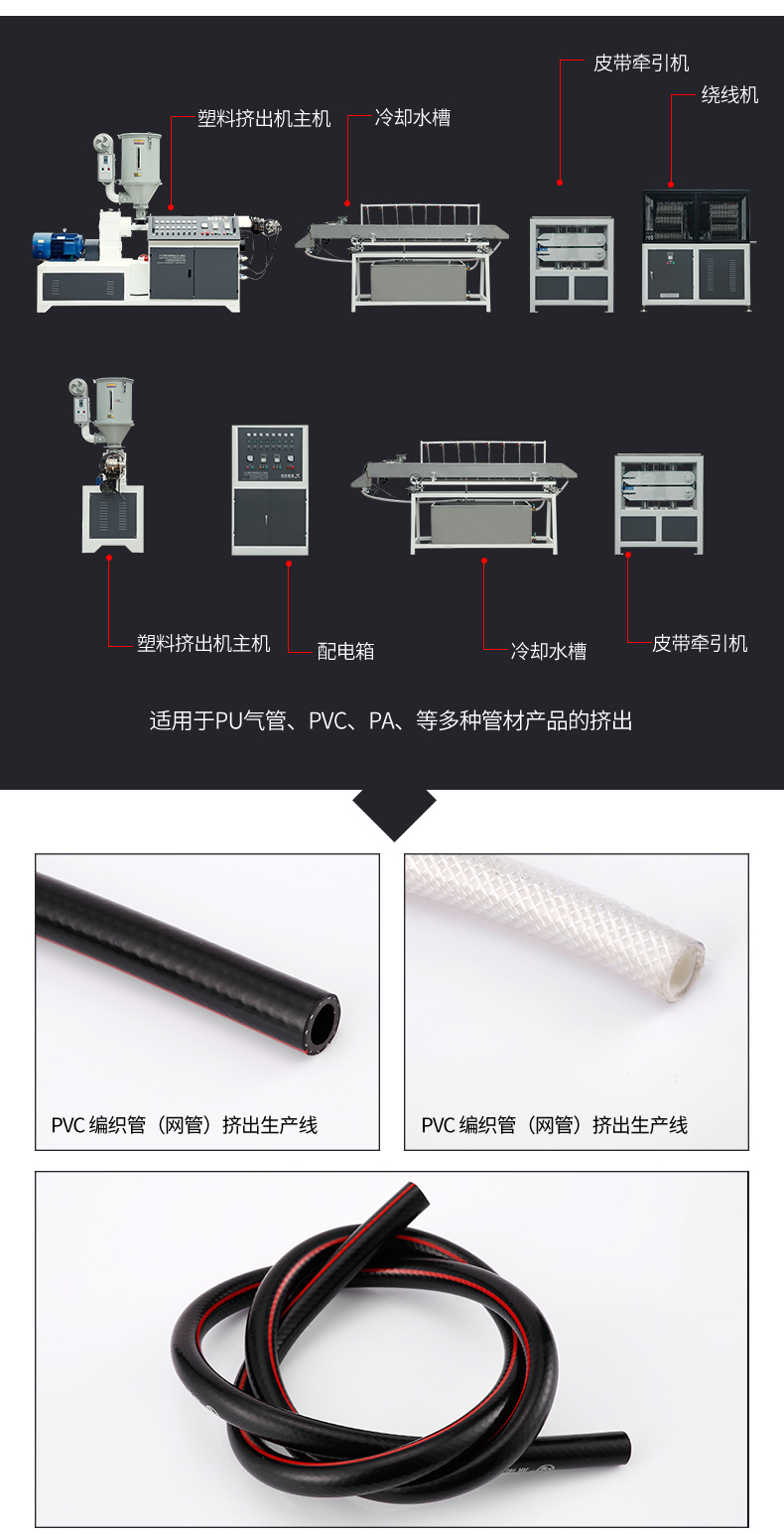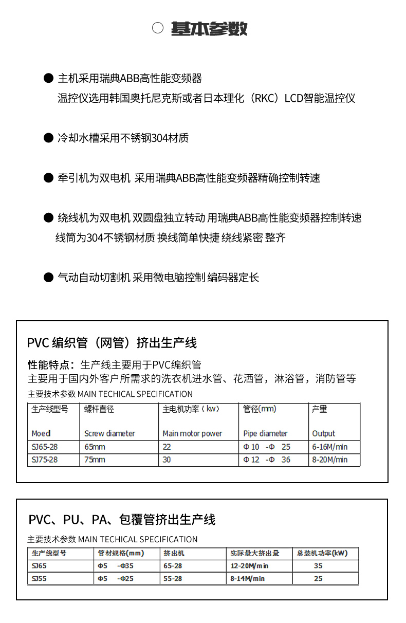 性能特點:生產線主要用于PVC編織管,pu以及pa編織管的生產,主要用于國內外客戶所需求的花灑管,淋浴管,消防管,以及汽車上的剎車管和耐高壓油管,